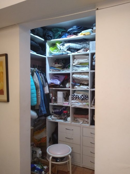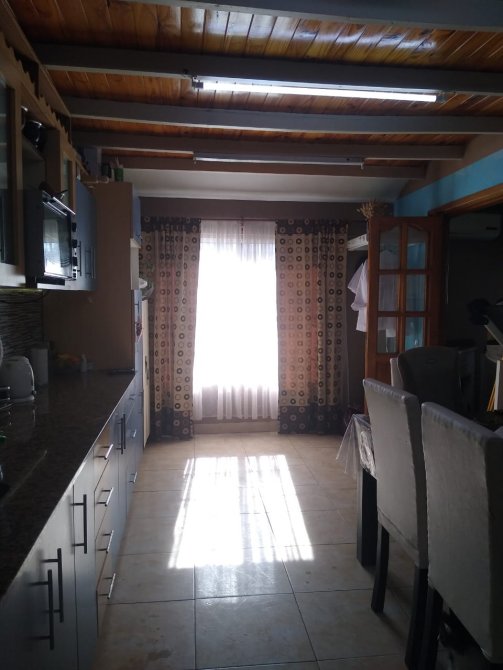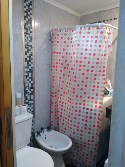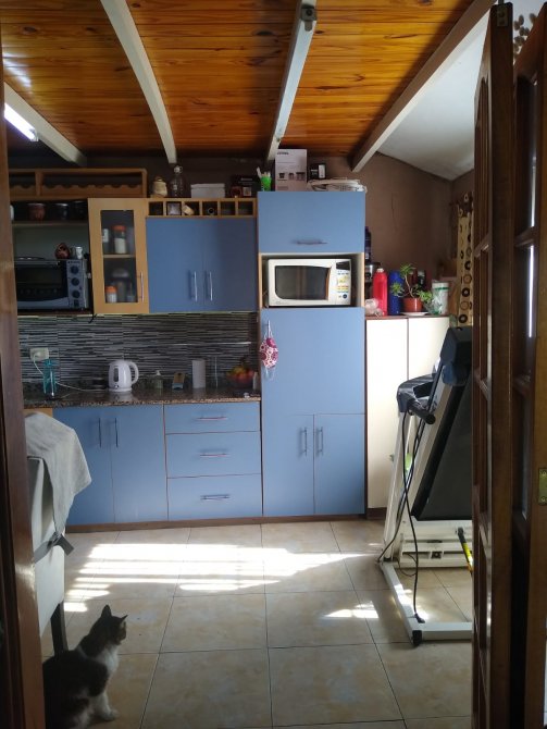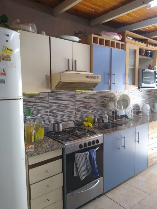 Cocina con puerta de madera y vidrios repartidos, muebles sobre y bajo mesada, distribuidor. Baño completo con bañera.