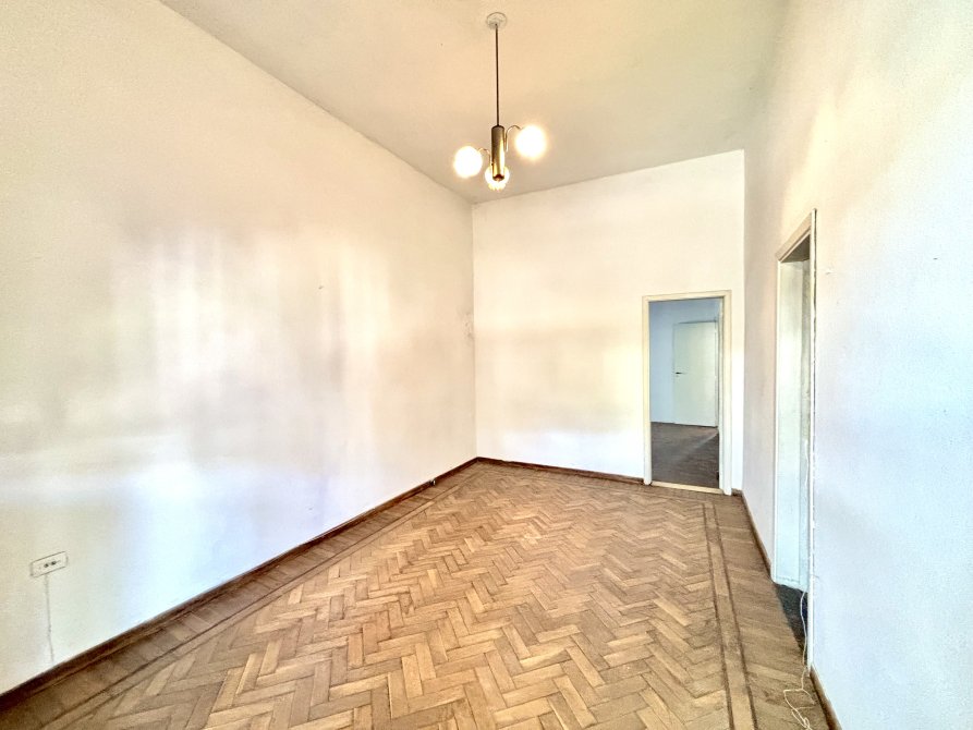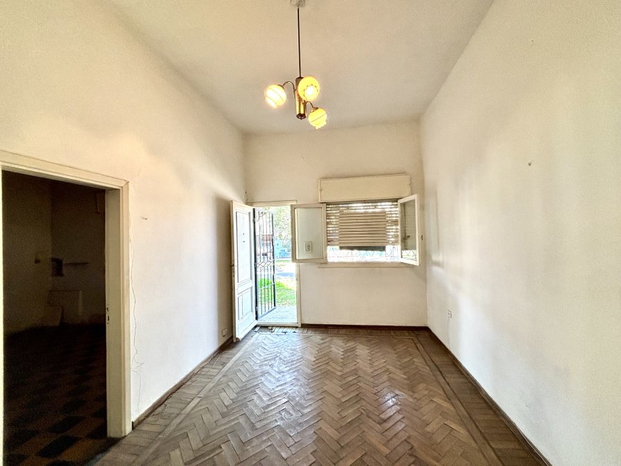 Living amplio con elegante piso de parquet, persiana de madera y ventana con rejas.