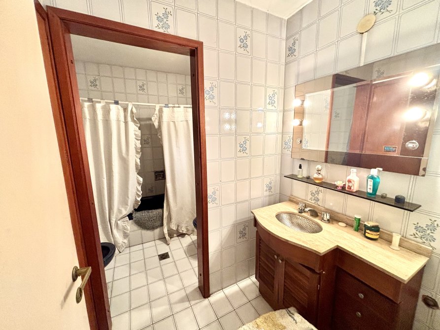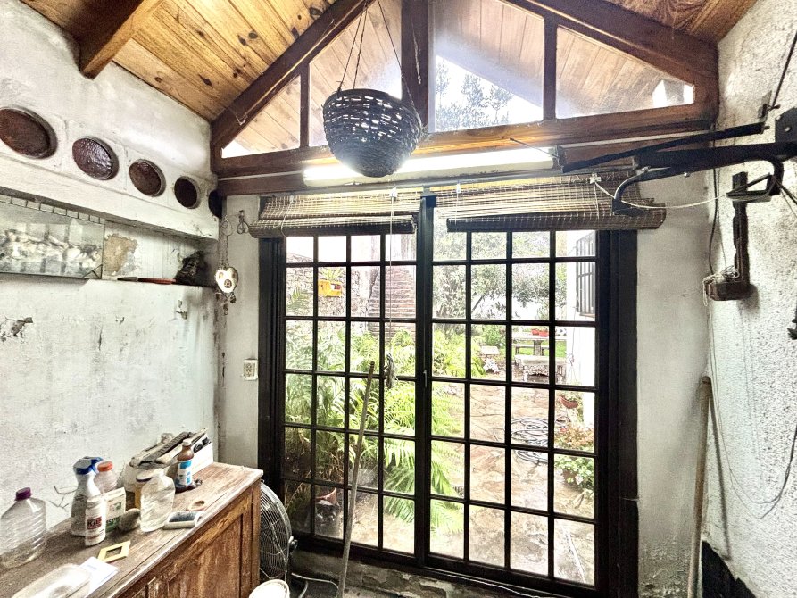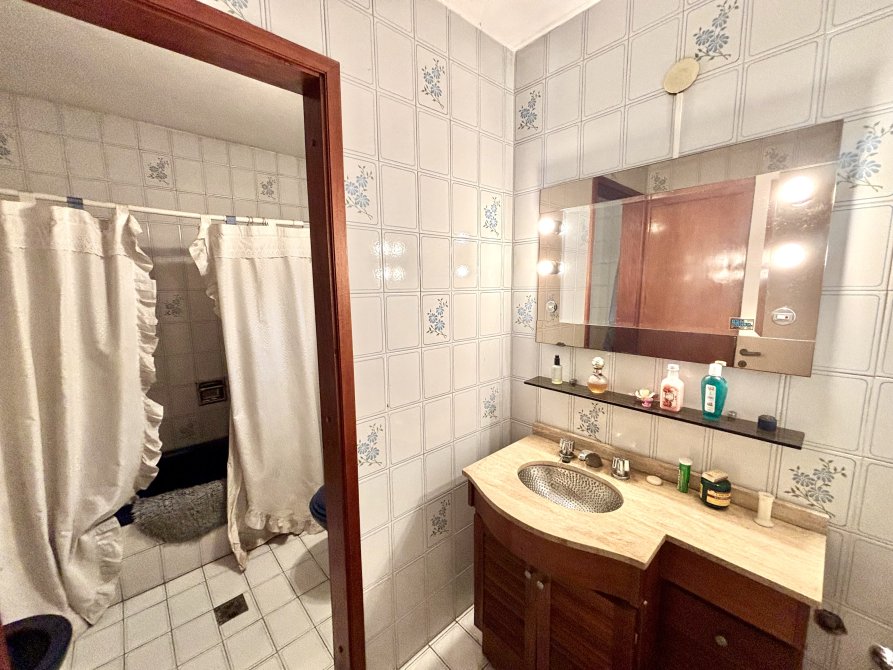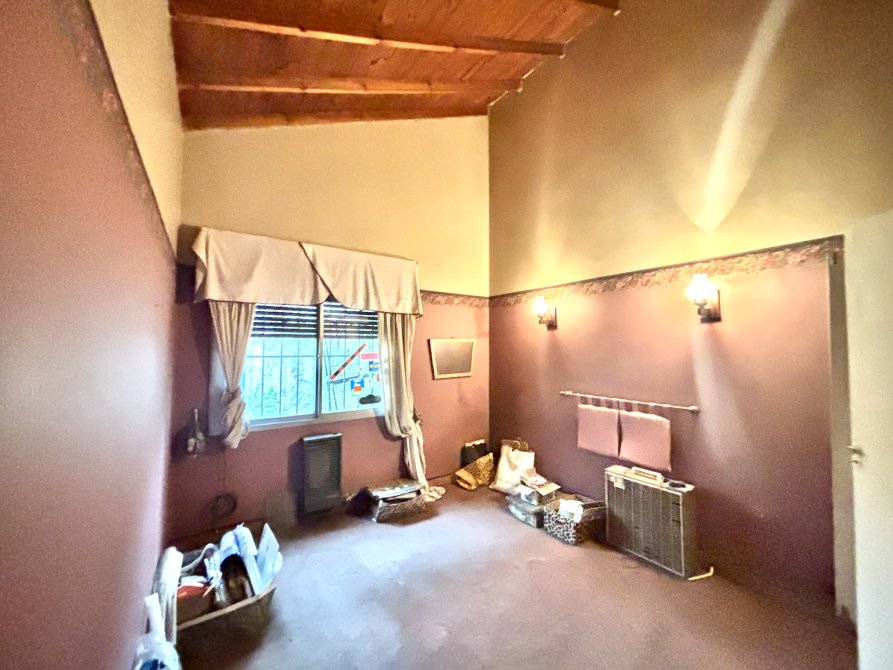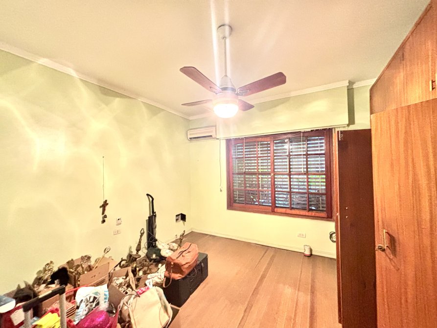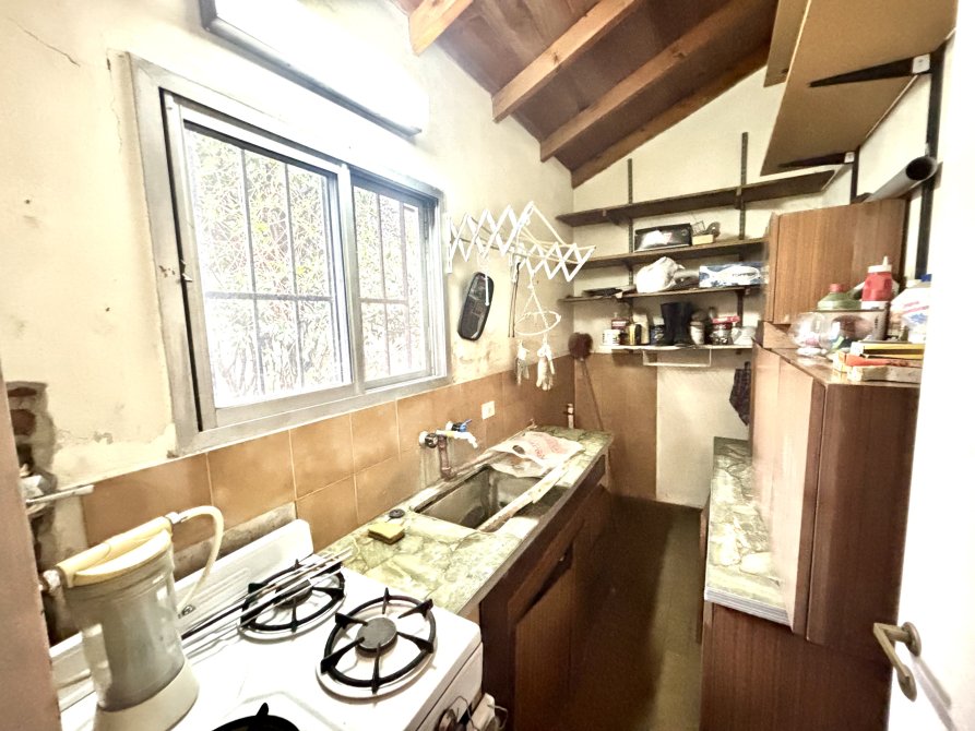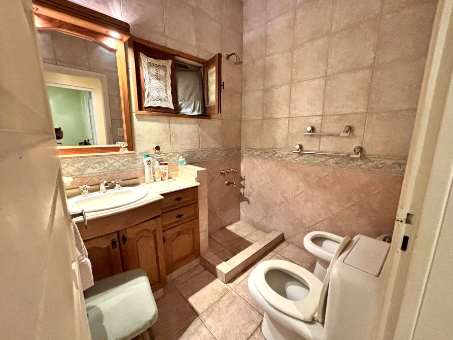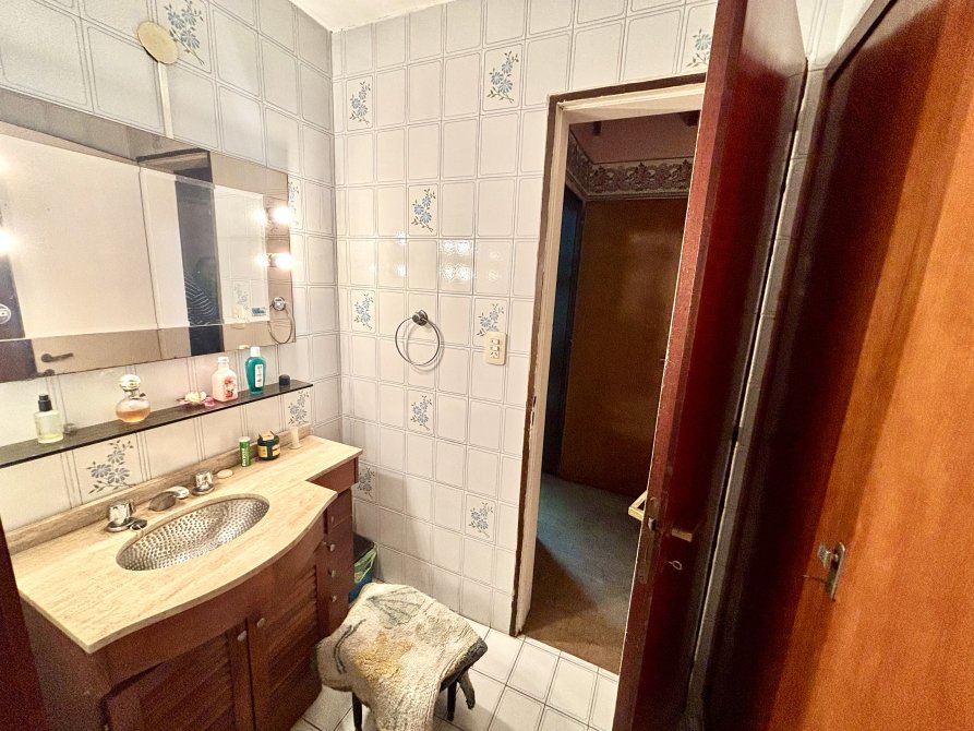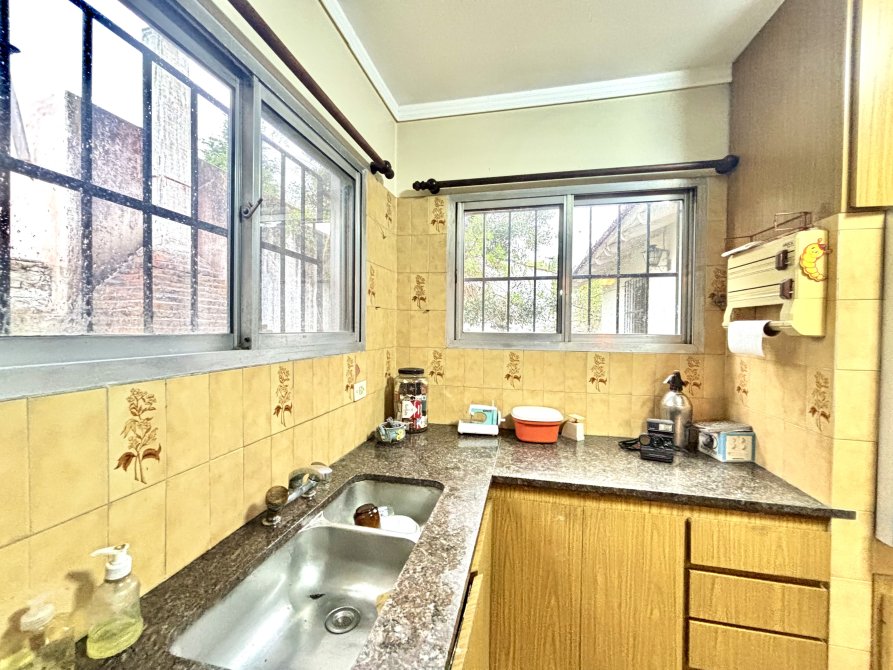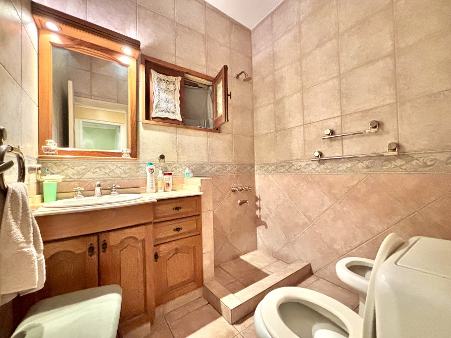 La casa dispone además de un segundo baño completo (antebaño y baño con bañera), un tercer dormitorio con vista al jardín del fondo y una segunda cocina auxiliar conectada a un pasillo de distribución. Desde allí también se accede al jardín trasero.