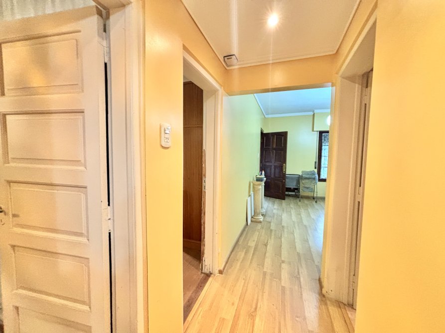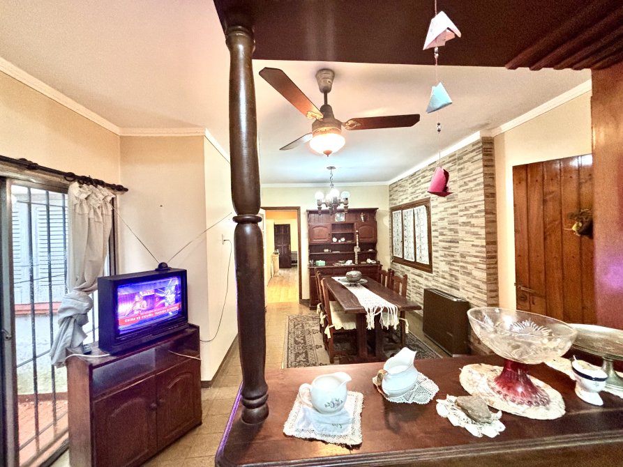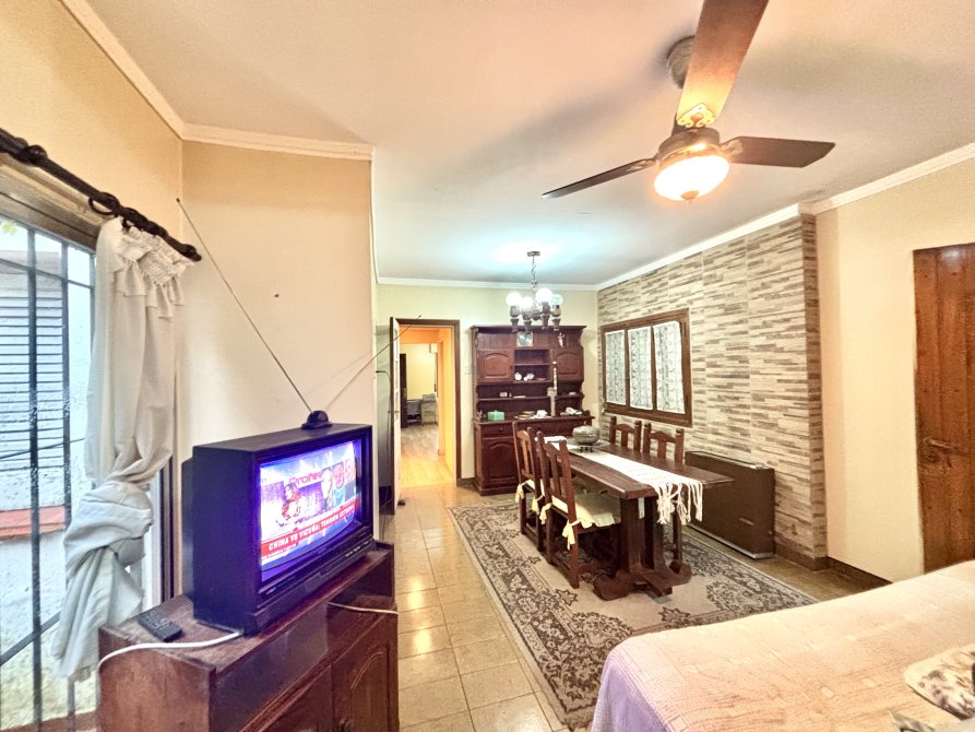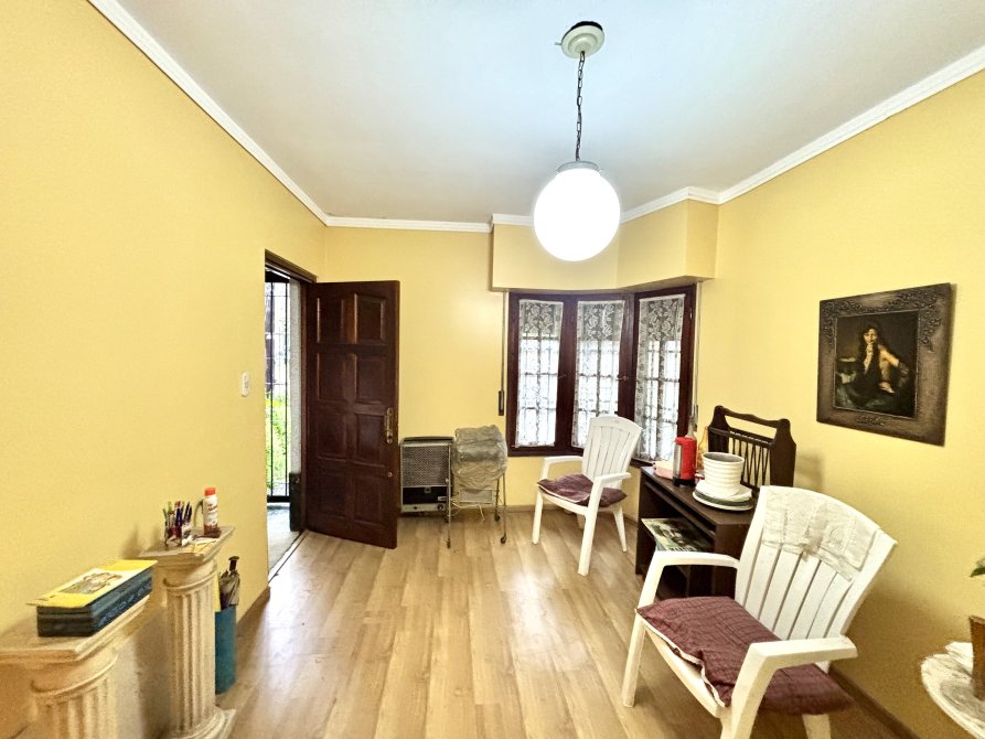 El ingreso principal se realiza a través de un pequeño porch con rejas y alero, que conduce al living, luminoso y con vista al frente. Desde allí se accede al pasillo de distribución, donde encontramos: