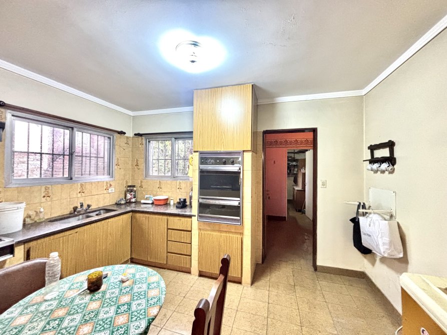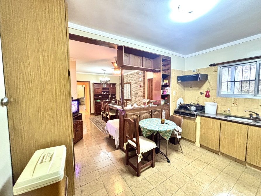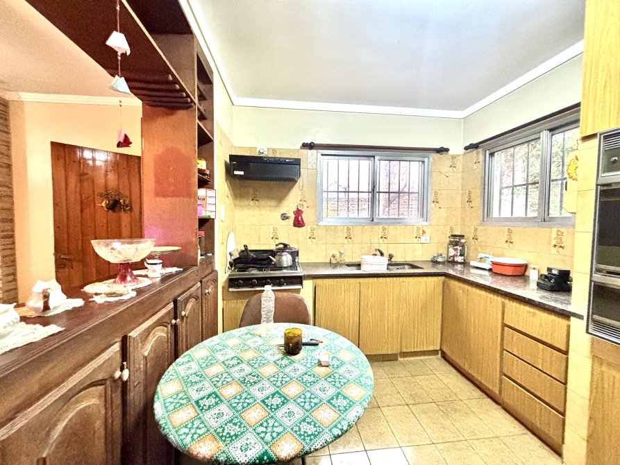 Continuando, se accede al comedor diario, de generosas dimensiones, que comunica con el garage y con el patio interno. La cocina principal, amplia y funcional, cuenta con barra desayunadora y ventanas al patio, lo que le otorga excelente luz natural.