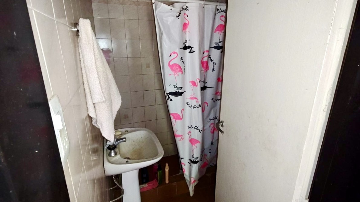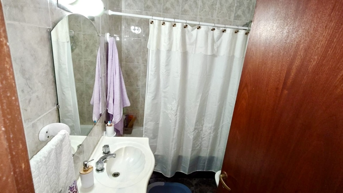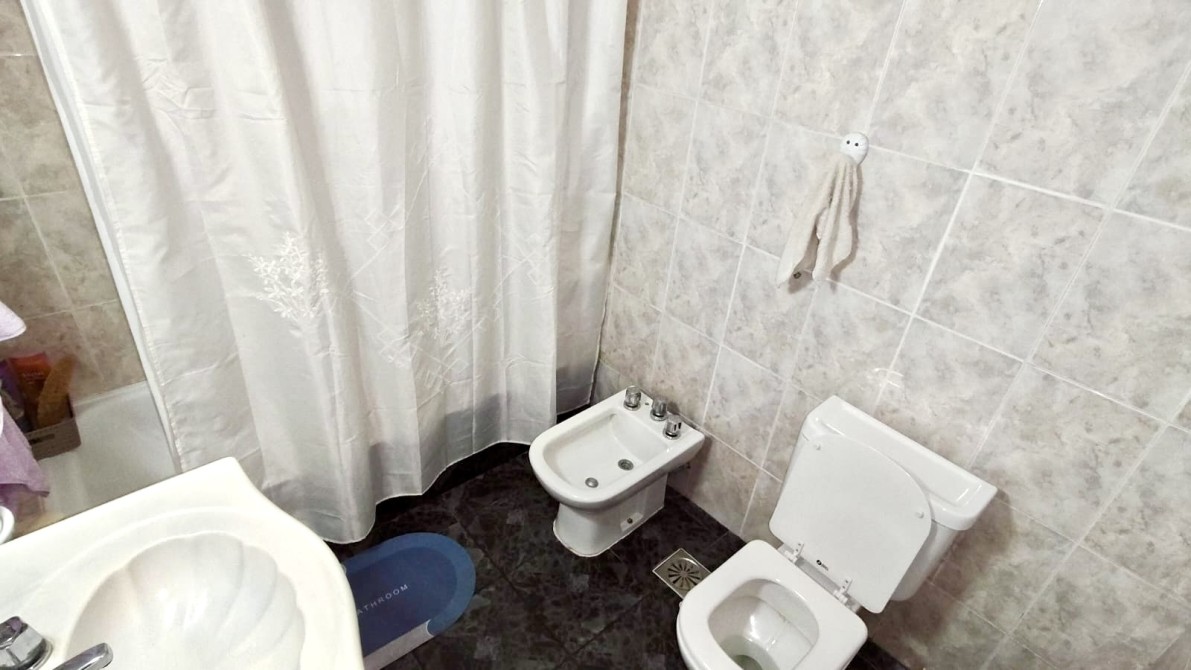 hacia un lado, un pasillo que conduce al baño completo con bañera y a tres dormitorios, todos con pisos cerámicos. El dormitorio principal se ubica al frente, el segundo posee vista al patio y el tercero es interno.