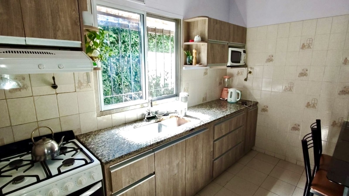 Desde el living también se accede a una cómoda cocina comedor diario, equipada con mesada de mármol y muebles bajo y sobre mesada. A través de un pasillo se llega al lavadero, con salida al patio y amplio parque.